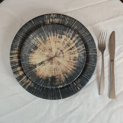 צלחות מלמין בקוטר 20 ס"מ למנה ראשונה ו-27 ס"מ למנה עיקרית ,בצבע שחור זהב מעוצבות עם טקסטורות מרהיבות וגימור טבעי שמשלים כל שולחן. במבט ראשון, קשה להבדיל בינן לבין פורצלן יוקרתי, אך יתרונותיהן המעשיים הופכים אותן לבחירה המושלמת.